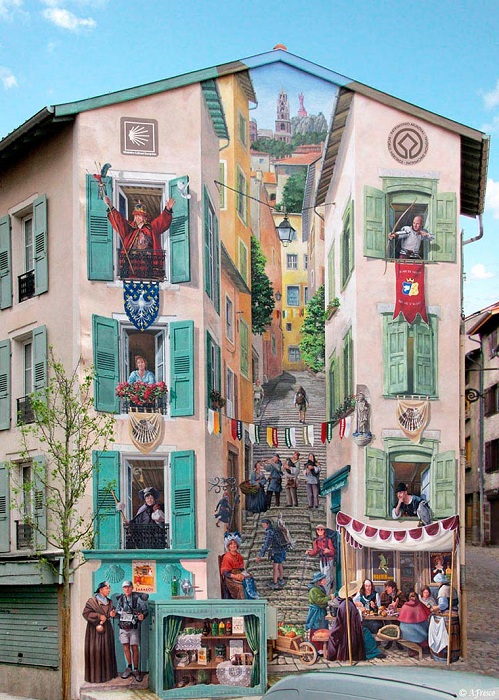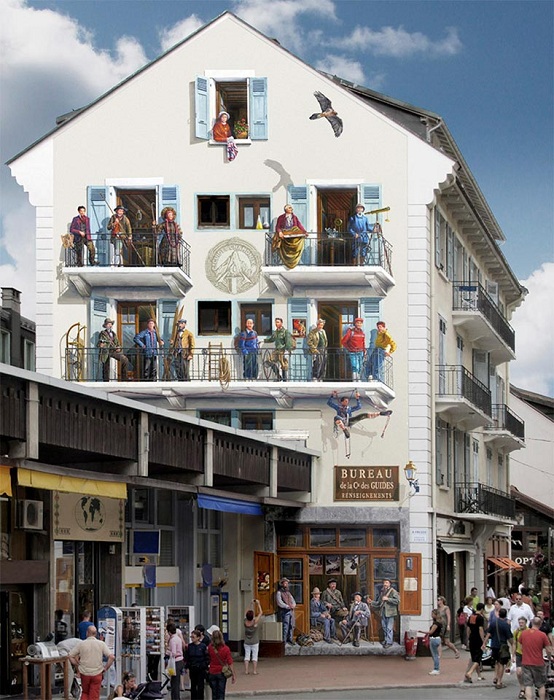 На некогда пустых стенах появляются окна, балконы или сценки из повседневной жизни горожан. Примечательно то, что все сюжеты пронизаны безграничным позитивом и человеколюбием.