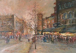 Второе действие оперы происходит на улице. Латинский квартал Парижа. Площадь на перекрестке улиц. Разные лавочки, слева кафе «Момю». Вечер. Канун Рождества. Продавцы и лавочники громко хвалят свои товары. В толпе Рудольф с Мими. Коллен около продавщицы старого платья. Шонар около старьевщика рассматривает трубку и рог.