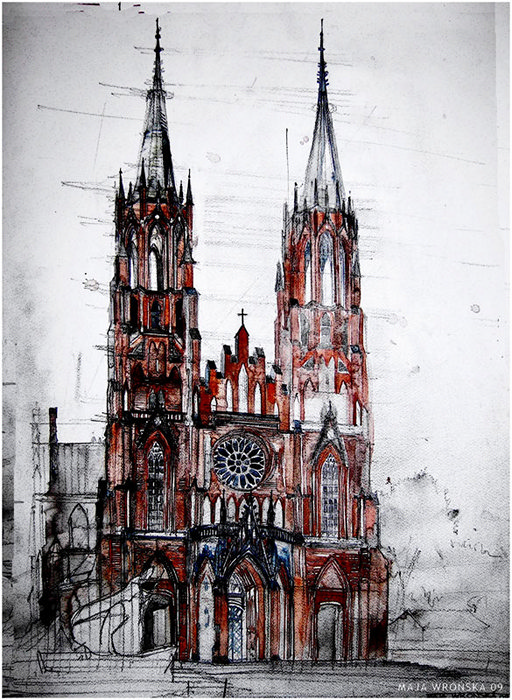 Театры и музеи, костёлы и церкви, дворцы, аристократические здания, и даже целые улицы, выложенные брусчаткой и украшенные старинными фонарями, - все это дарит Майе Вронской вдохновение и воодушевление, ведь она не только художник, но и будущий архитектор. Автор изучает архитектуру в Варшавском технологическом университете, отсюда такой живой интерес к городскому пейзажу и неподдельное восхищение от шедевров архитектурного искусства. В коллекции акварелей у Вронской - прекрасные виды современного Парижа и Франкфурта, Венеции, Праги, Варшавы, Рима, Флоренции, Кракова и других европейских столиц, не только официальных, но и творческих.
