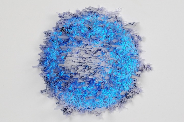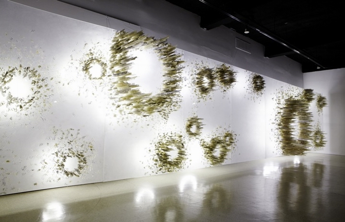 Издалека может показаться, что ничего особенного в скульптуре нет, - и лишь по пристальном рассмотрении становится ясно, что на всех угловатых формах, созданных руках Юн-Ву Чо, сохранились отдельные печатные слова. Уже давно никому не интересная газета, выпущенная месяц или год назад, переживает новое рождение, а смысл слов уступает место красоте абстрактной геометрической формы.