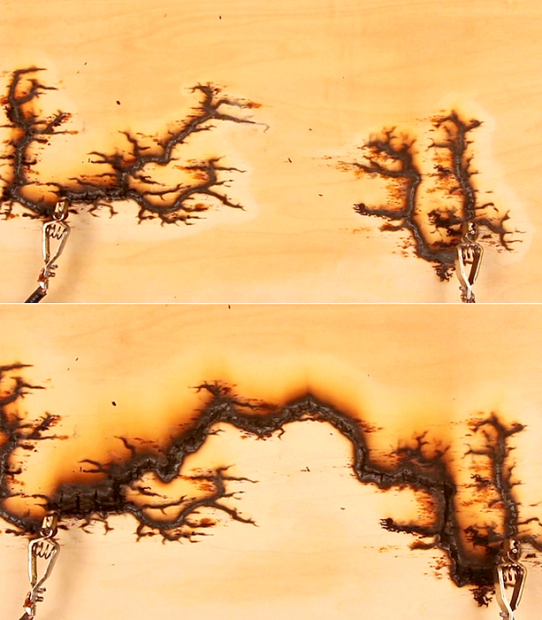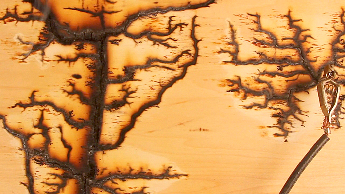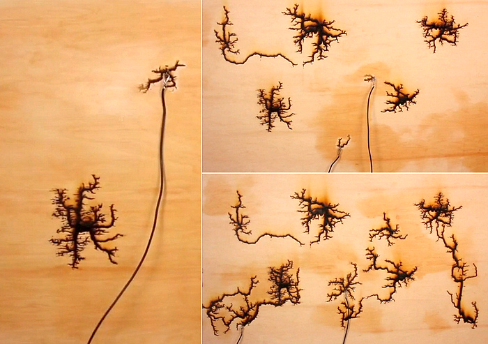 Процесс появления и вырастания электрических деревьев, а в некотором роде и их форма, зависит исключительно от разновидности и качества панели, которую впоследствии украсят отпечатки молний. Как утверждает автор проекта, волокна многослойной фанеры, а также клей, который использовался для формирования этой панели, существенно влияют на характер и направление "течения" следов, оставляемых молниями. Это происходит очень медленно и плавно, как бы нехотя, что добавляет процессу очарования. По всей видимости, созерцание того, как лист фанеры прорезают молниями электрические разряды, войдет в перечень тех вещей, за которыми можно наблюдать вечно.