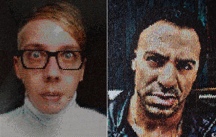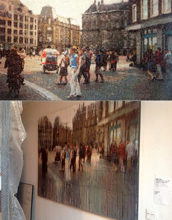 Инъекциями краски в прозрачные пупырышки упаковочной пленки Брэдли Харт уже нарисовал портреты Стива Джобса и самого себя, певицы Тамии и художника Germinio Pio Politi, а также лица других людей, городские пейзажи и абстракции. Любопытно, что когда картина готова, деревянная подставка, к которой все это время была прикреплена пузырчатая пленка, тоже становится картиной. Такой же разноцветной и яркой, но размытой и нечеткой, нарисованной подтеками акриловой краски. Глядя на них кажется, что смотришь на ту самую, оригинальную работу художника, но сквозь залитое дождем стекло. Атмосферно и креативно, особенно если учесть, что такая техника рисования все еще остается достаточно популярной. Так вместо одной картины художник рисует сразу две. Кстати, на выставках, в которых Брэдли Харт принимает участие со своим арт-проектом Injections, он всегда экспонирует оба результата творческого процесса.