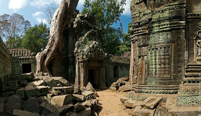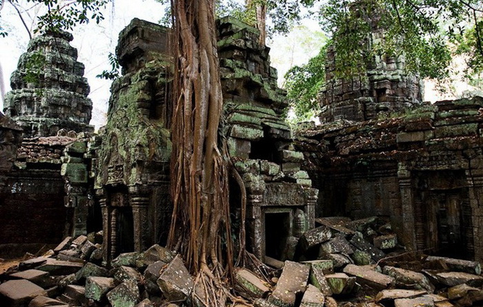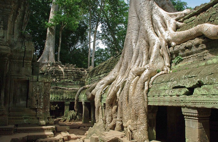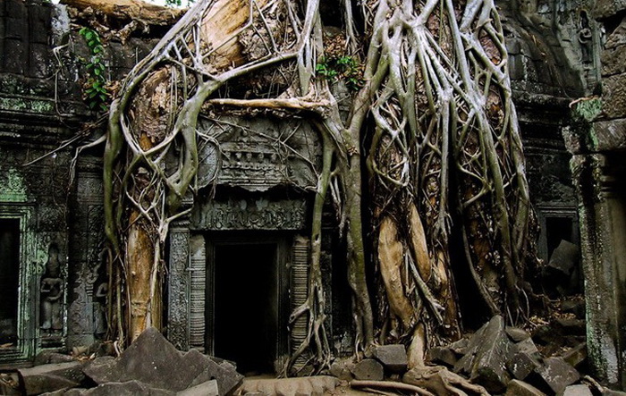 Грандиозный монастырский комплекс Та-Прохм (Ta Prohm), расположенный в Камбодже, буквально сросся с окружающим его тропическим лесом: сквозь полуразрушенные постройки к небу прорываются огромные деревья, высота которых иногда превосходит 40 метров. Такой уникальный культурный памятник появился не в результате разорения - в своё время храм был умышленно оставлен его обитателями на милость джунглям.