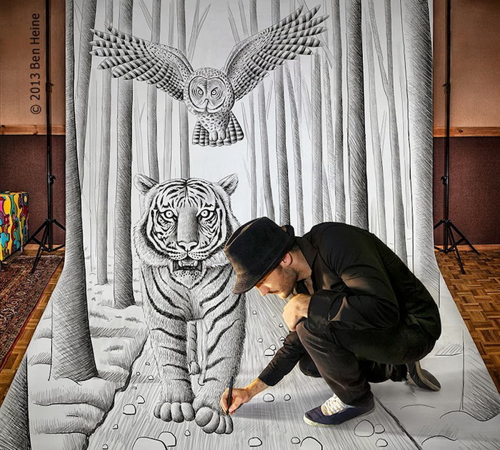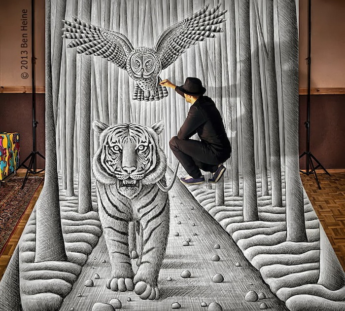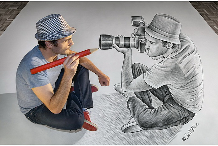Современный бельгийский художник Бен Хайне (Ben Heine) недавно представил серию огромных 3D-рисунков, выполненных карандашом. Изюминка проекта в том, что сам мастер визуализаций не прочь проникнуть «внутрь» виртуальной реальности, по крайней мере, глядя на картины, создается именно такое впечатление.