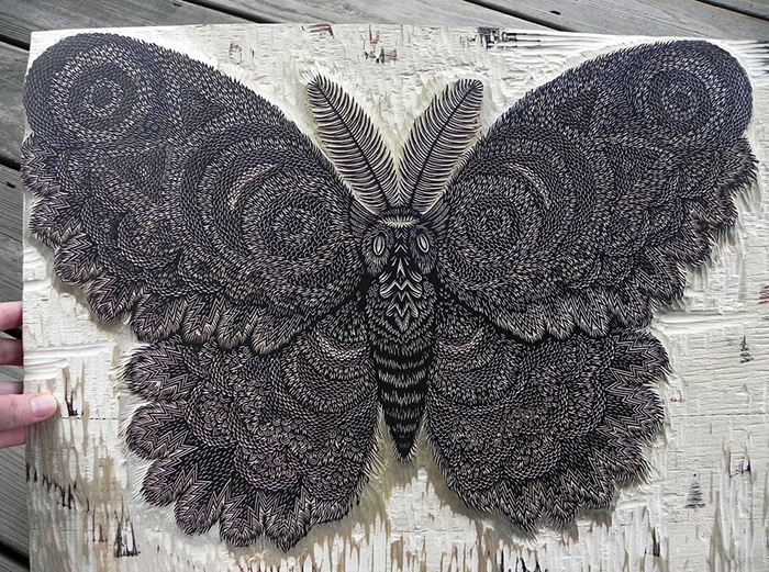 Об их эксклюзивных принтах ручной работы мы уже писали на сайте Культурология.Ру. Читателям наверняка запомнилась работа The Moon, в которой художники воспроизвели «портрет» луны в мельчайших подробностях. Новая работа талантливого арт-дуэта носит название The Moth. Да-да, художники решили создать изображение обычной моли, правда, назвать готовую ксилографию (оттиск на бумаге с деревянной печатной формы) «обычной» просто язык не поворачивается, ведь утонченное изображение выглядит просто роскошно.