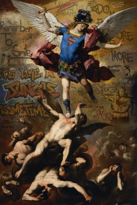 Архангел Михаил сражается с падшим ангелом в костюме супермена.