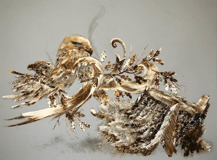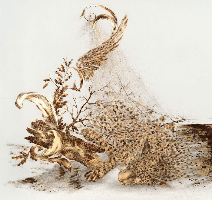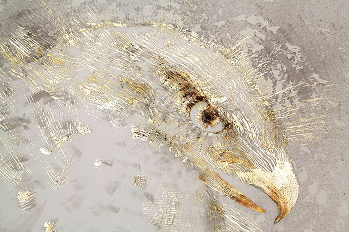 На рисунках – звери и птицы, художница черпает вдохновение в природе и создает роскошные изображения. Материал был выбран ею не случайно: золото – символ материального благосостояния, и многие достигают его, уничтожая окружающую среду.