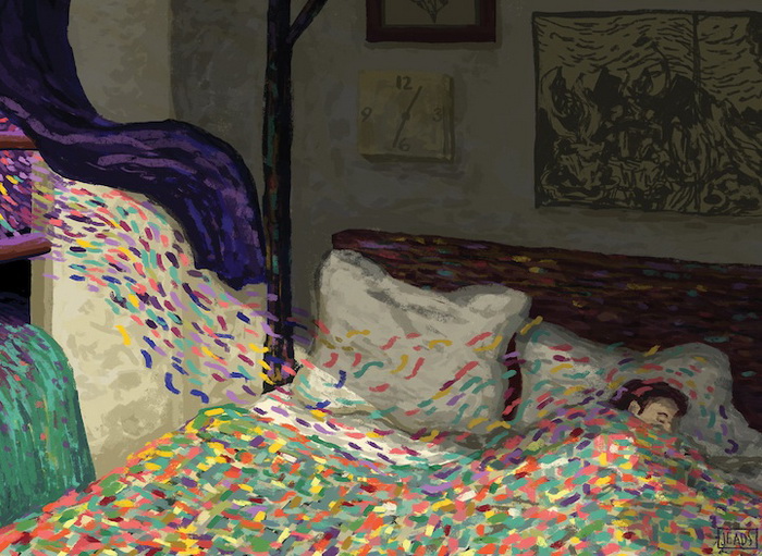 На первом этапе художник создает эскиз будущей картины, хотя окончательный вариант редко полностью совпадает с наброском. На создание каждого рисунка требуются долгие часы кропотливой работы, ведь автор прорисовывает все до мелочей, оставляя зрителям возможность долго рассматривать готовое изображение, отыскивая новые и новые детали, не попавшие сразу в его поле зрения.