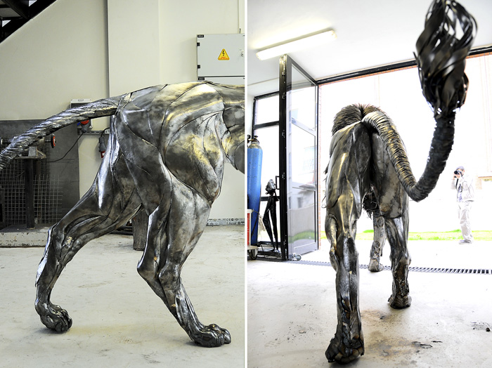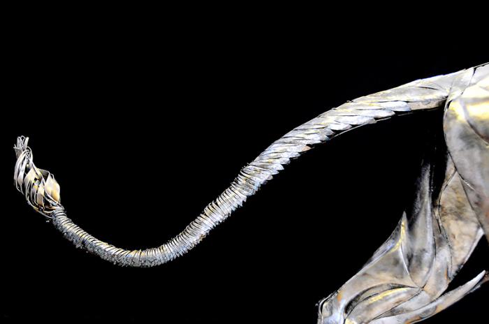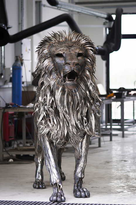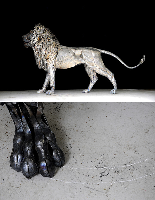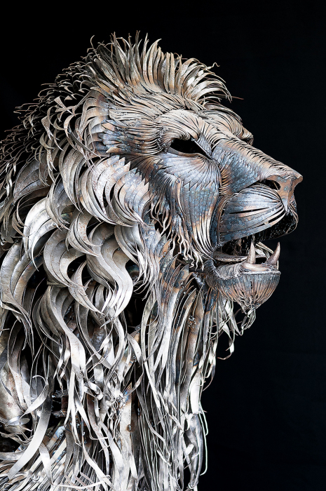 На создание этой изящной, высокодетализированной скульптуры у Йылмаза ушло десять месяцев. На протяжении почти целого года скульптор вручную вырезал, придавал нужную форму и прилаживал друг к другу каждую металлическую пластину: от больших и тяжелых деталей корпуса до узеньких полосок на хвосте и голове льва. Работа, мягко говоря, не из легких и, как сам Йылмаз шутливо комментирует на DeviantArt, требует терпения и готовности время от времени испытывать боль. Скульптура получилась величественная, причем не только с точки зрения эмоциональной выразительности, но и по габаритам. Готовая киса выше своего автора и весит четверть тонны.