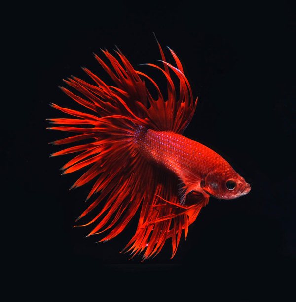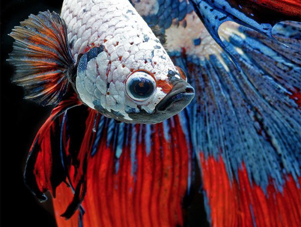 Яркие Bettas смотрелись бы менее эффектно, если бы фотограф не отделил фон, оставив рыбок красоваться на черном фоне. Этот прием позволил оценить и красоту роскошного хвоста водоплавающих, и необычность цветовой расцветки. Сиамские боевые рыбы знамениты своей неприхотливостью. Именно поэтому их часто покупают детям, не опасаясь, что домашний любимец вследствие плохого ухода всплывет брюхом вверх.