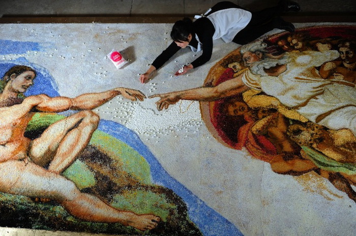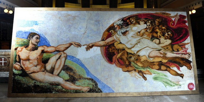 Микеланджело Буонарроти – один из величайших мастеров эпохи Ренессанса. В этом году исполняется 450 лет со дня его смерти, и современные художники и скульпторы прикладывают массу усилий для того, чтобы почтить его память. Один из наиболее крупных арт-проектов принадлежит Мишель Уибоу (Michelle Wibowo). Эта мастерица умудрилась воссоздать фреску «Сотворение Адама», использовав для этого сладости!