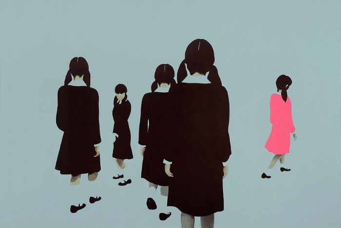 Лаконичные картины, выполненные в спокойной гамме, кажется, исследуют пугающую пустоту повседневности. Лишенные всякой детализации, работы польского мастера выглядят одновременно тревожными и умиротворяющими. Названия художник подбирает под стать: «На берегу» («On the shore»), «В школе» («At school»), «Влюбленные» («Lovers») - односложные и простые, они будто бы подтверждают, что ничего не происходит: предсказуемость и пустота.