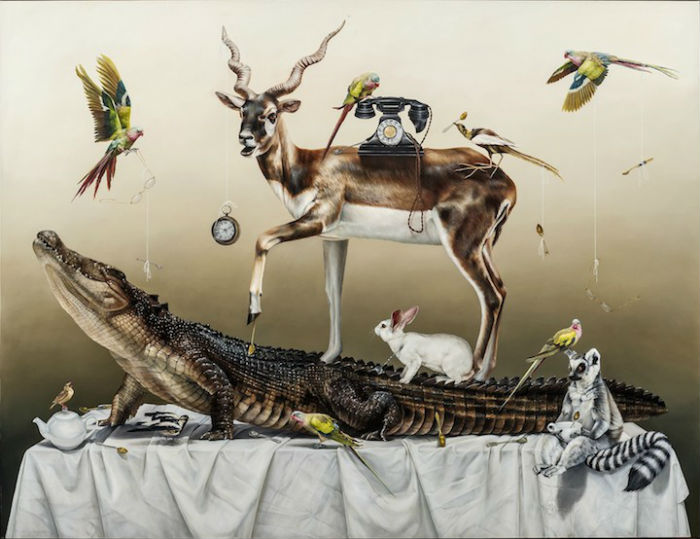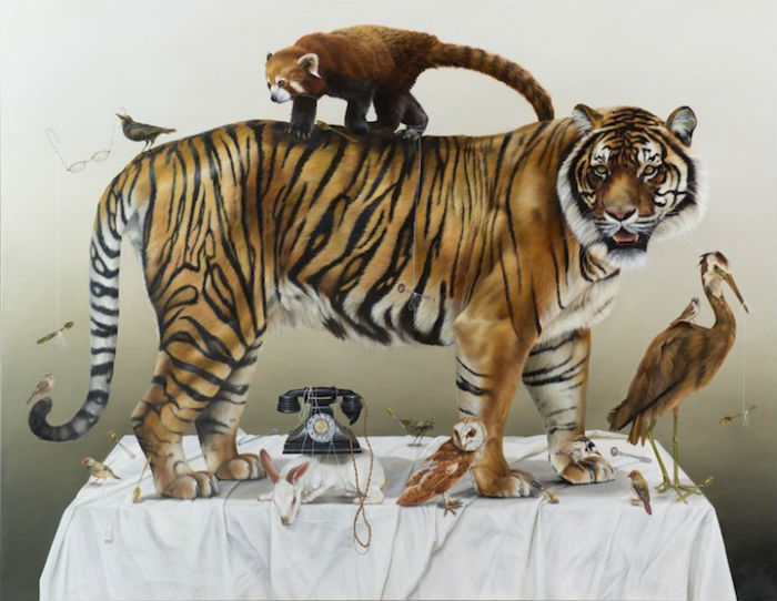 Своих животных художница изображает на белой скатерти в окружении немного абсурдных и несколько, как кажется, неуместных деталей