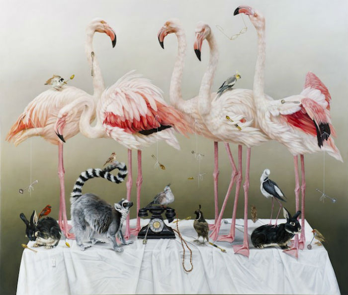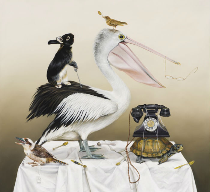 Художница Кейт Бергин (Kate Bergin) живет и работает в Австралии. Свою «коллекцию» животных и птиц Бергин преподносит зрителю в лучших традициях натюрморта: на белой скатерти в окружении немного абсурдных и несколько, как кажется, неуместных деталей.