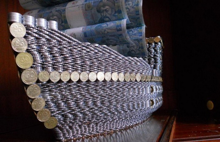 Несмотря на то, что украинская экономика переживает сейчас не лучшие времена, жители этой страны не теряют оптимизма и верят, что любой кризис можно преодолеть. Например, Сергей Кнуров из Николаева, предпочитает вкладывать деньги в искусство в прямом смысле этого слова. Находчивый украинец сконструировал модель корабля из 17 тысяч монет различного номинала, а в качестве парусов использовал пятигривневые банкноты.
