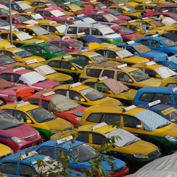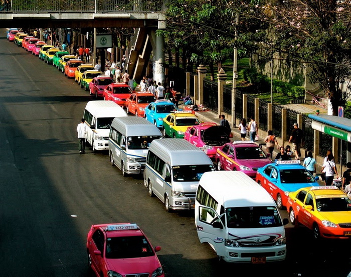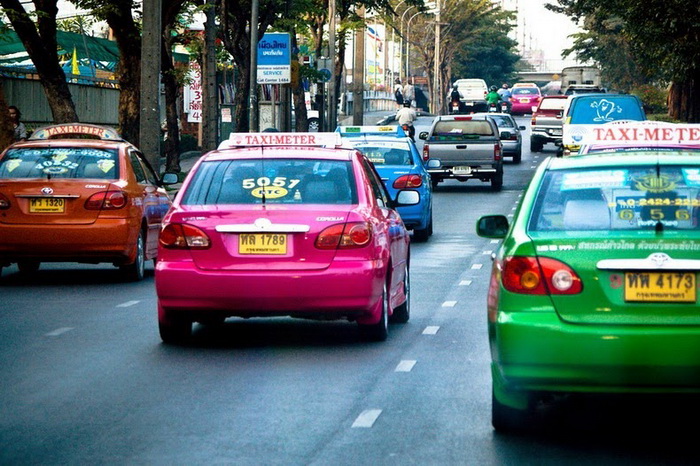 Желтое такси уже давно стало «визитной карточкой» Нью-Йорка, а без черных такси сложно представить себя улицы Лондона. Мало кто знает, что в Бангкоке автомобили «по вызову» тоже легко отличить от общего потока машин. Правда, таиландцы (в отличие от американцев и англичан) предпочитают разнообразную цветовую гамму, поэтому здесь авто красят во все цвета радуги. Розовые, оранжевые, фиолетовые, зеленые и желтые машины снуют по городу, развозя клиентов.