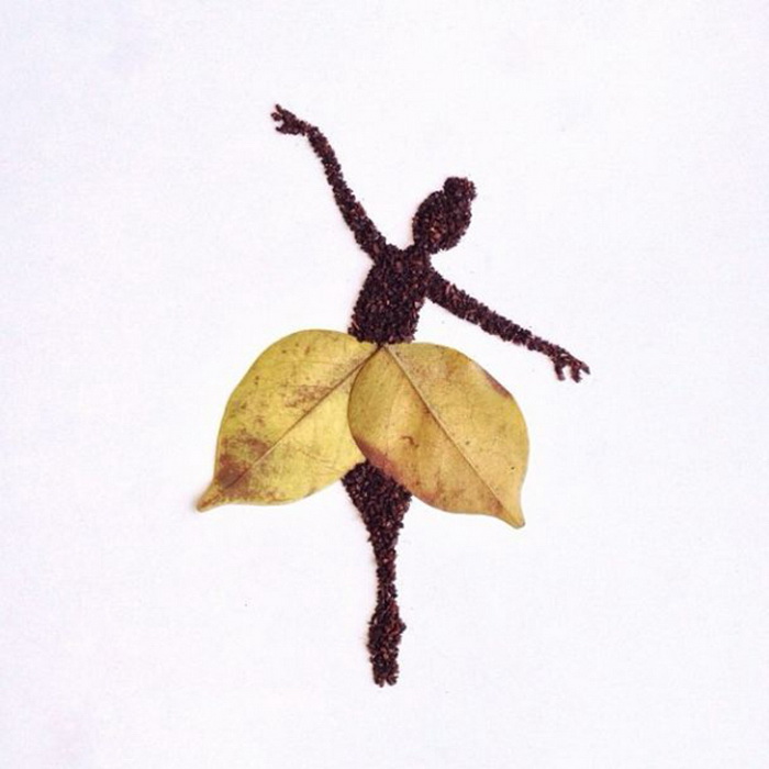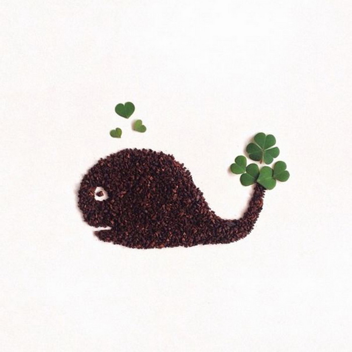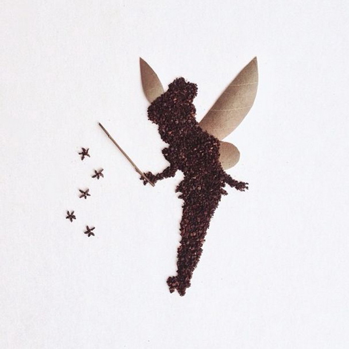 Свои минималистические иллюстрации художница создает при помощи зубочистки, иначе «сложить» из кофейных гранул изображение просто невозможно. Изредка она дополняет рисунок листьями или палочками, чтобы придать композиции законченный вид. Каждый рисунок – это крохотная история, как правило, светлая и романтичная.