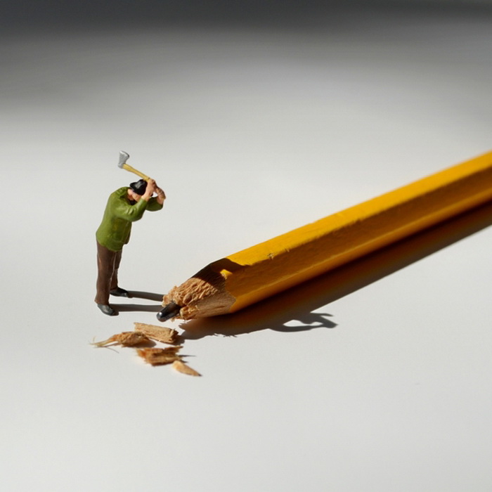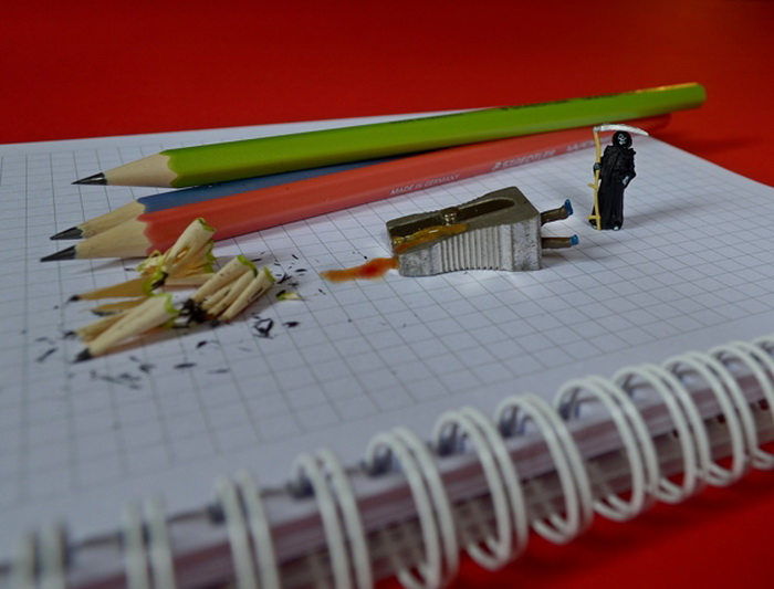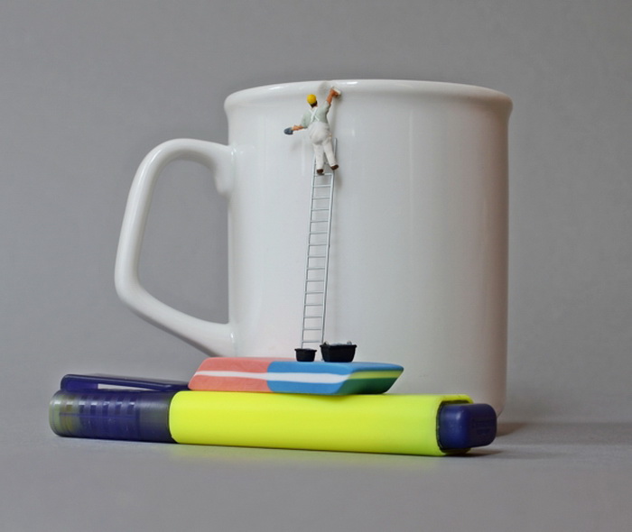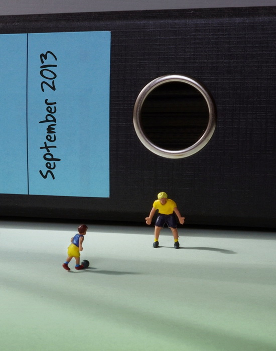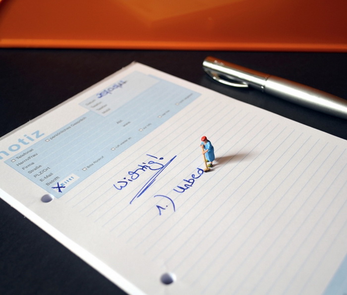 Обычный офисный стол Беттины Гюбер превратился в мир, полный не только развлечений, но и опасностей. Так, бумажные «отходы» из дырокола стали прекрасным свадебным украшением, линейка и маркер – качелями, а канцелярская папка – футбольными воротами. А вот точилка для карандашей оказалась смертельной ловушкой для незадачливого человечка. Сочетание крохотных фигурок с канцелярскими принадлежностями, которые выглядят на их фоне гигантскими, рождает абсолютно новые смыслы. Беттина Гюбер с удовольствием придумывает все новые сюжеты для своих фотографий и предлагает зрителям самим поэкспериментировать подобным образом. Похоже, это действительно отличное развлечение на рабочем месте, куда более оригинальное, чем раскладывание пасьянсов на компьютере.