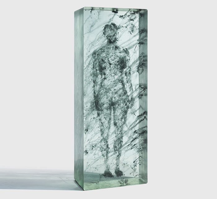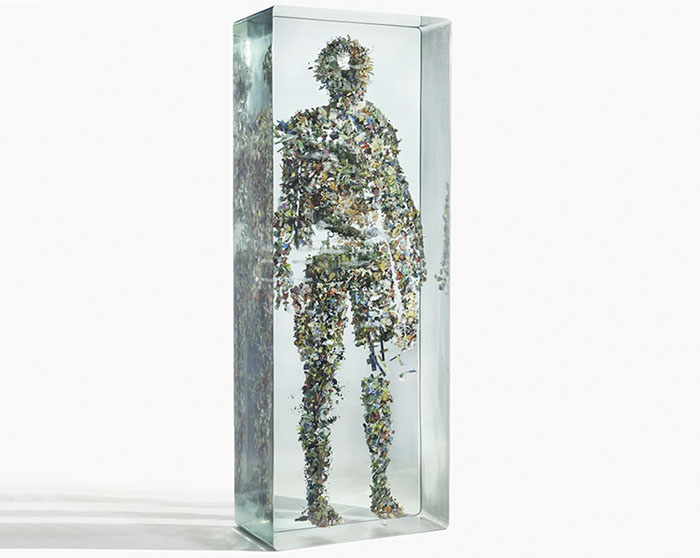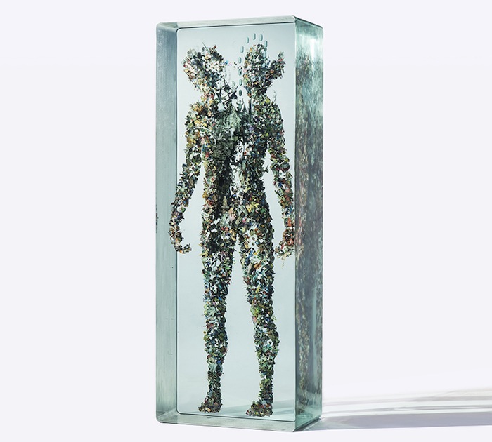 Пёстрая взвесь из тысяч отдельных элементов всевозможных форм, цветов и размеров складывается в человеческие силуэты, заключённые в многослойную прозрачную массу тяжелого стекла. Автор этих необычных скульптур (или трёхмерных коллажей), объединённых в серию «Психогеография» («Psychogeographies»), — работающий в смешанной технике художник из Бруклина Дастин Йеллин (Dustin Yellin).