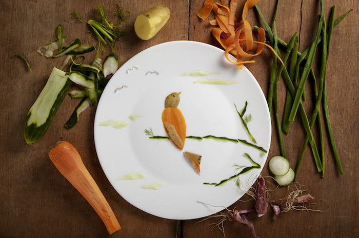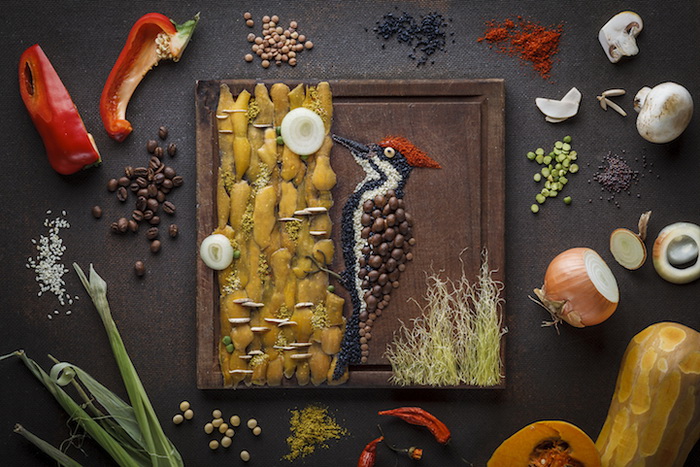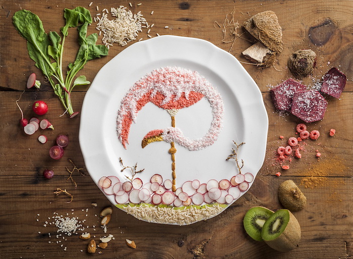 Анна Джойс творчески подошла к процессу: перед нами утонченный фламинго из измельченных фруктовых хлопьев, мудрая сова из риса и лапши, птичка-невеличка с оранжевым опереньем из моркови. Рядом с «рисунками» фотограф разместил те продукты, которые были использованы художницей.