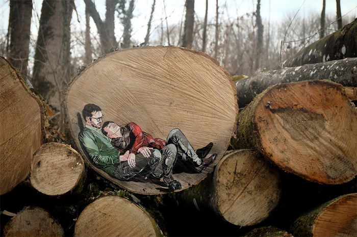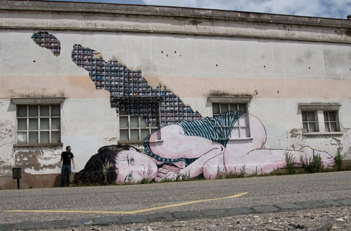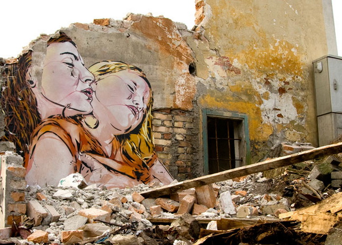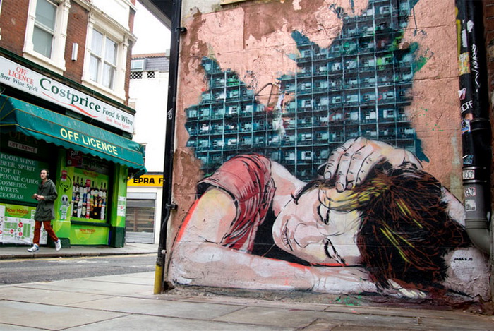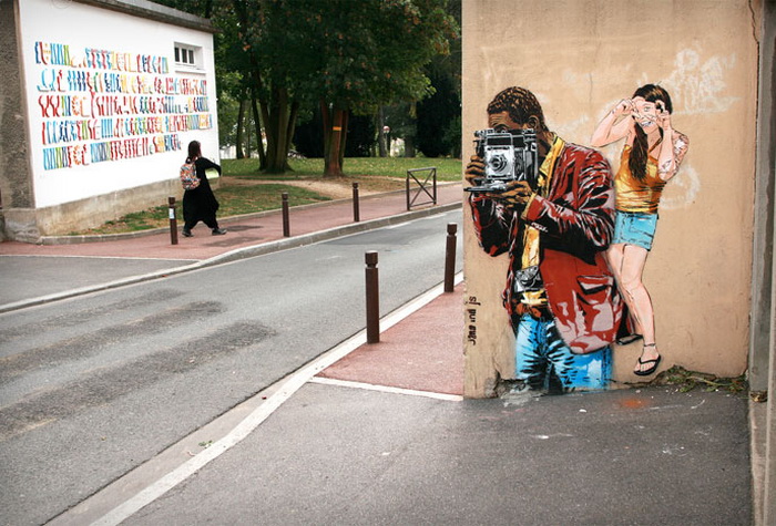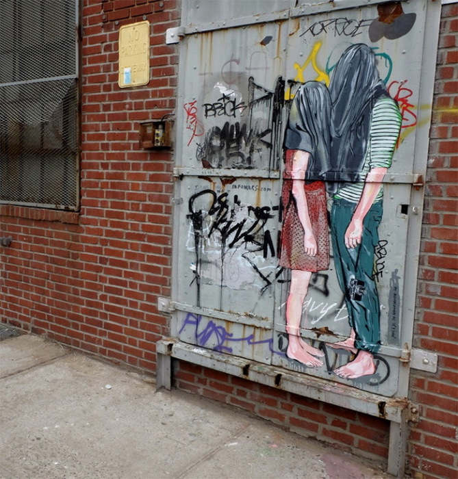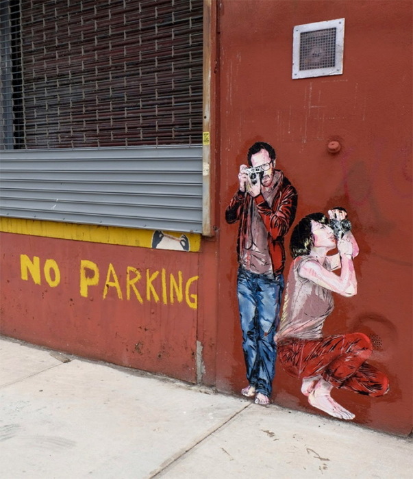 Причем, очевидцы утверждают, что картины художников настолько реалистичны, что издалека нарисованные силуэты не отличишь от настоящих. Именно поэтому стрит-арт творческого дуэта настолько популярен среди туристов. Люди с удовольствием фотографируются на фоне раскрашенных стен, чтобы похвастаться снимками перед друзьями и знакомыми. Кстати, на нашем сайте тоже публиковалась статья с ранними работами Jana & JS.