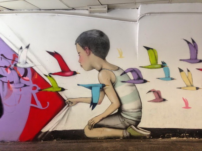На одном из рисунков изображен мальчик, который стоит на коленях. Приподняв занавес, он открыл путь для радуги и стаи разноцветных птиц. На другом граффити мы видим девушку, которую буквально уносит с собой вихрь ярких красок. Пожалуй, художник столь оригинальным способом попробовал показать окружающим, сколь разнообразным может быть восприятие реальности, намекнул на то, что чудеса – близко, а отыскать все краски жизни можно в том случае, если отдаться на волю чувств, вдохновения и веры в лучшее. Безусловно, дети более восприимчивы к прекрасному, однако и нам, взрослым, ничего не мешает на мгновение забыть обо всем и окунуться в увлекательный мир волшебства, вдохнуть полной грудью!