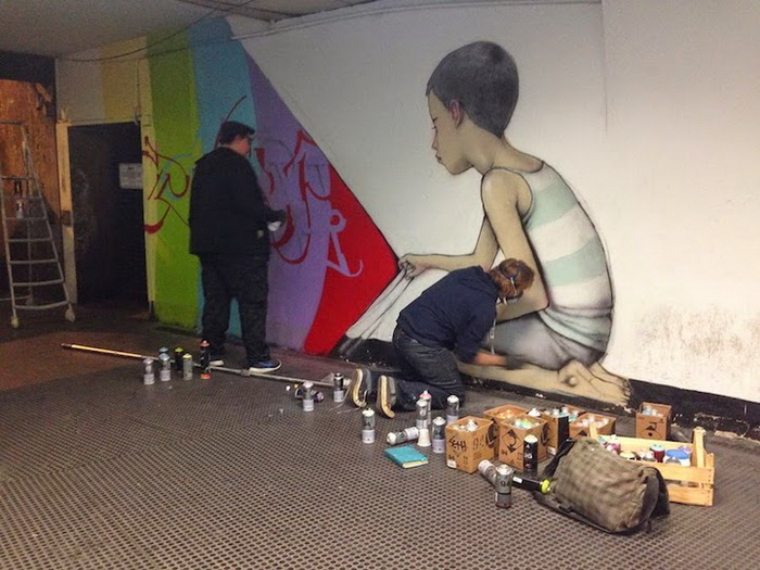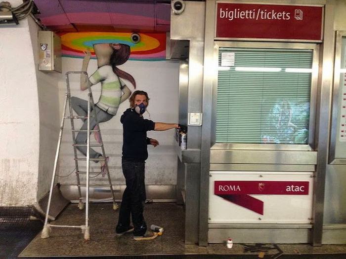 На этот раз своими незаурядными работами француз порадовал жителей Италии. Станцию метро Piazza Di Spagna отныне украшают два рисунка, на которых изображены дети. Граффити были нарисованы специально для выставки «Urban Legends», которая организована музеем «MACRO». Радужное изображение наверняка поднимет настроение сотням пассажиров, которые ежедневно спускаются в подземку.