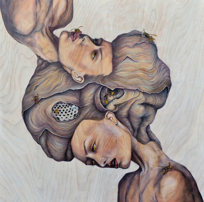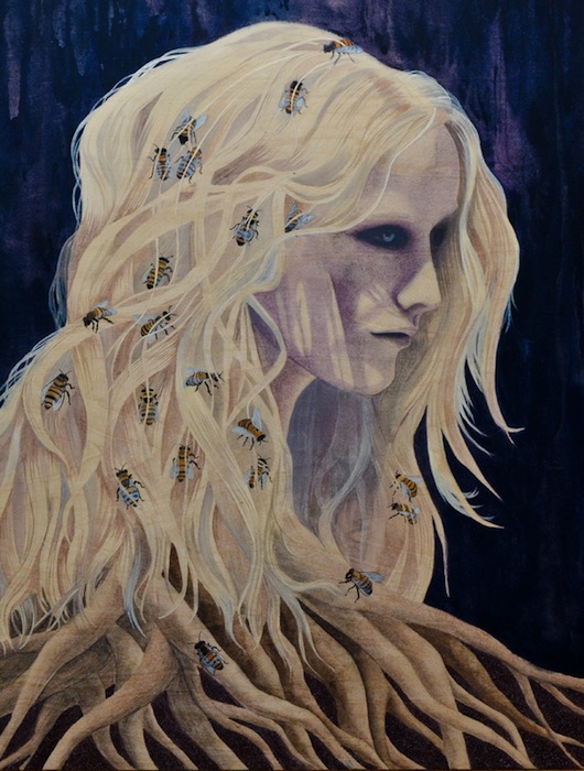 Один из повторяющихся мотивов в её живописи — это пчёлы, ползающие по отдельным светлым локонам