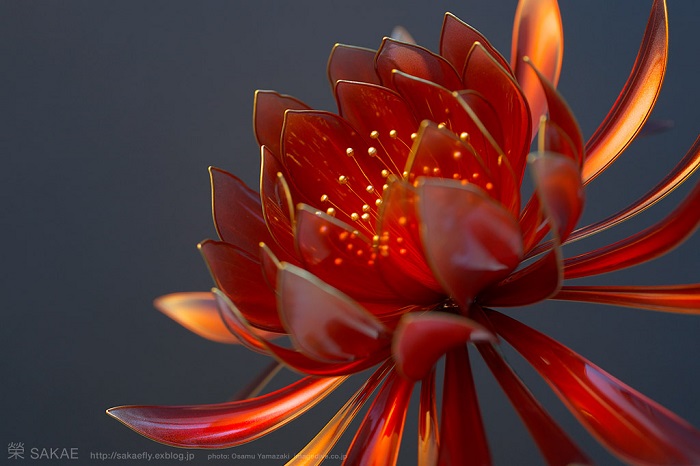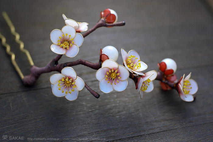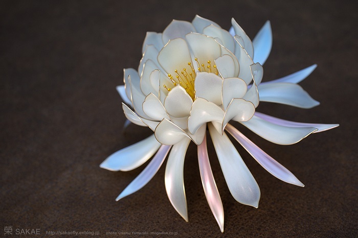 Художница Sakae придерживается старинной технологии создания канзаши. Она использует латунную проволоку и синтетическую смолу. Изгибая контур проволоки, Сакаэ заливает его тонким слоем смолы и, не давая остыть, придает будущему украшению нужную форму. И вот уже можно увидеть тонкие лепестки лотоса, легкие крылья бабочек, нежные цветки сакуры. Это настоящие произведения искусства. В зависимости от сложности, работа над той или иной фигурой может длиться от 3 до 30 дней.