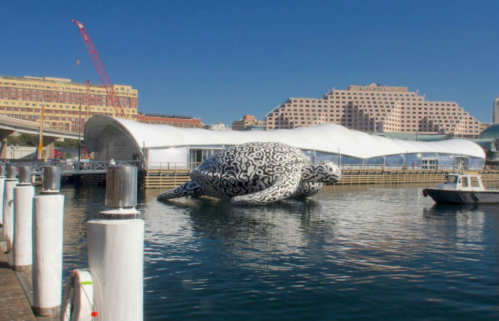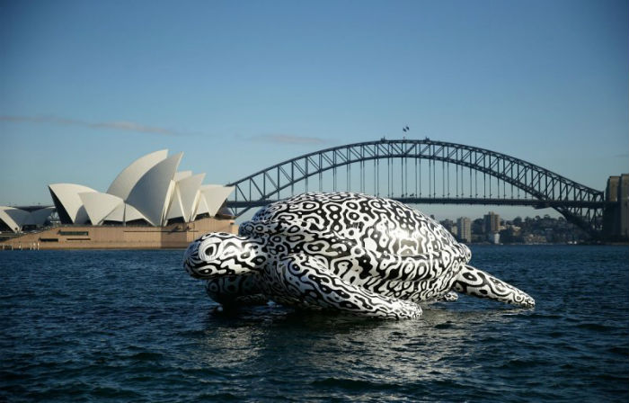 На днях в прибрежных водах Сиднея была замечена гигантская галапогосская черепаха. К счастью, повода для волнения нет: черепаха оказалась рукотворной. Пятнадцатиметровая надувная скульптура – арт-объект австралийского художника и скульптора Би Джей Прайса (BJ Price).