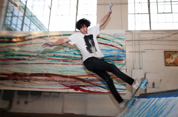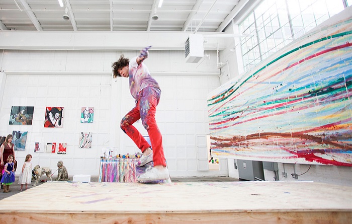 Молодой американский художник может заниматься двумя любимыми увлечениями одновременно: кататься на скейтборде и рисовать. Он создает свои произведения прямо перед удивленной публикой.