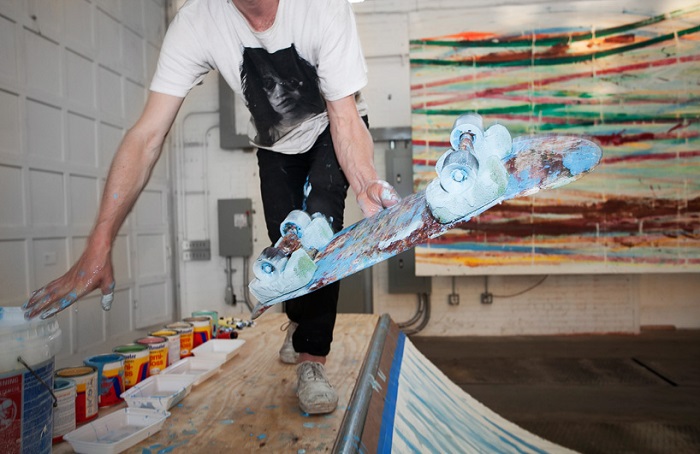 Художник вставляет между доской и колесами губки, напитанные краской. После чего он демонстрирует зрителям навыки катания на скейтборде, в процессе которого слой за слоем появляются абстрактные полосы разнообразных оттенков синего, красного, коричневого и других цветов.
