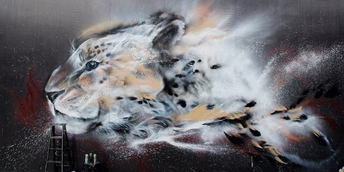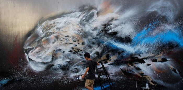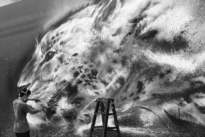 «Гепард, нарисованный брызгами чернил» («Splatter Ink Cheetah») – такое название получило это эффектное граффити. Hua Tunan не боится экспериментировать и смело совмещает технику китайской живописи тушью и метод разбрызгивания чернил, популярный на Западе. В результате образ гепарда получился динамичным, ярким, рисунок практически оживает на глазах у зрителя.