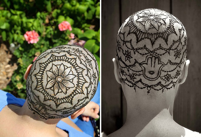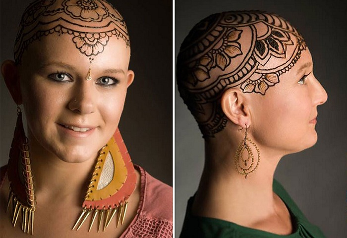 Красивые рисунок из хны, нанесенный на голову женщины, лишившейся волос.