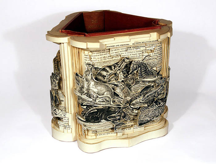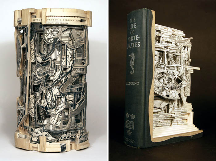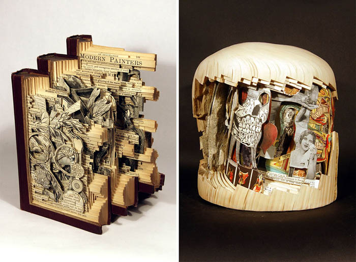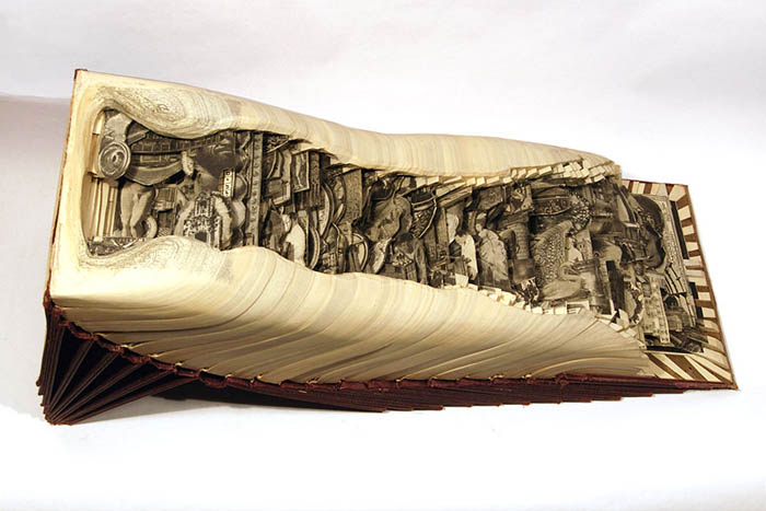 Брайан Деттмер (Brian Dettmer) из Чикаго называет себя книжным хирургом. В его умелых руках толстые учебники, карты и энциклопедии становятся потрясающими произведениями искусства. С помощью пинцета, ножа и скальпеля художник тщательно вырезает куски бумаги, скручивает страницы и иллюстрации так, что в итоге обычная книга превращается в замысловатую скульптуру.