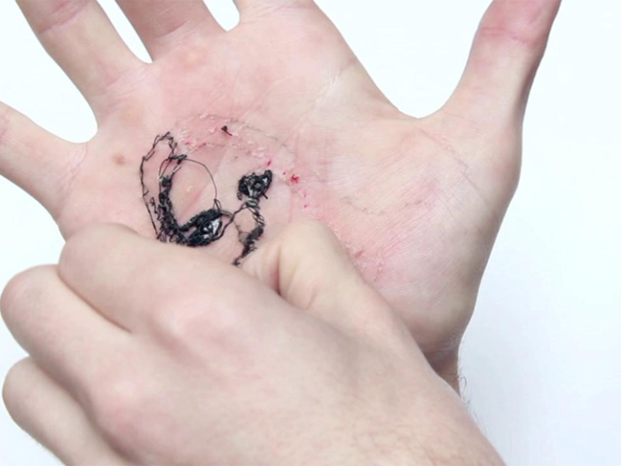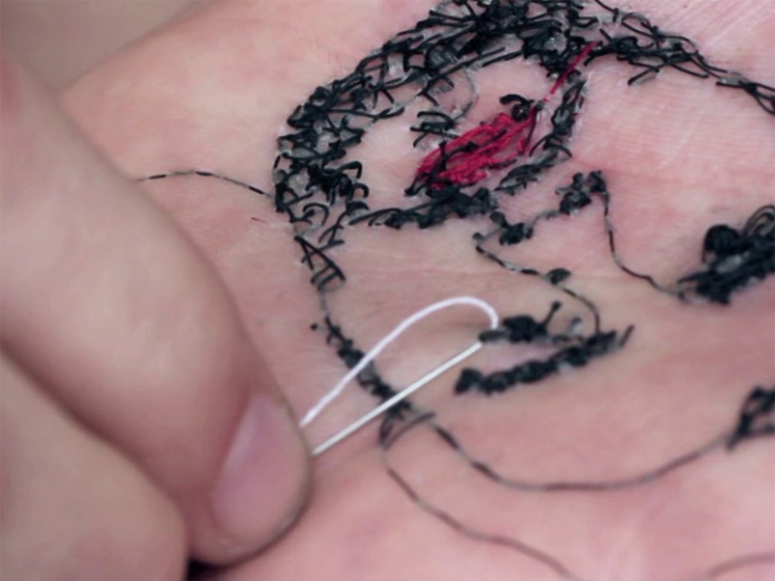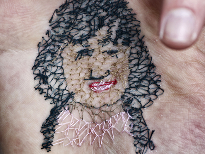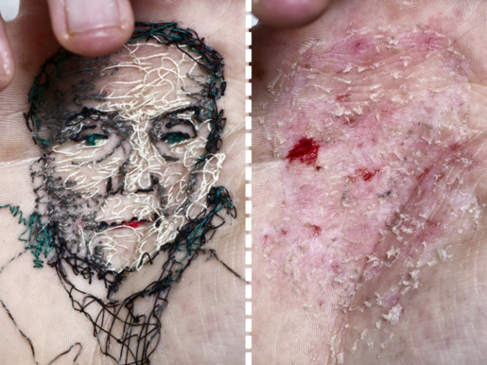 Даже такое, казалось бы, традиционное увлечение как вышивание может быть шокирующим, доказал художник, использующий в качестве полотна для своих работ собственные ладони.