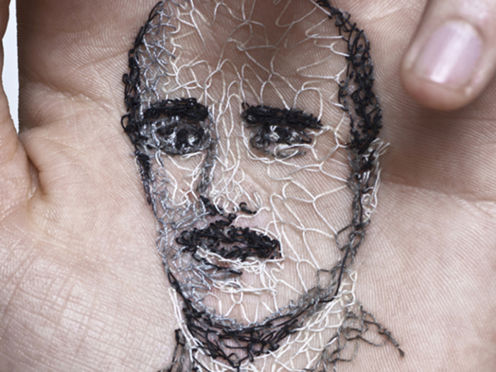 21-летний художник не довольствуется тем, что хранит фотографии близких и родных в бумажнике. Он вышивает их портреты на своих ладонях.