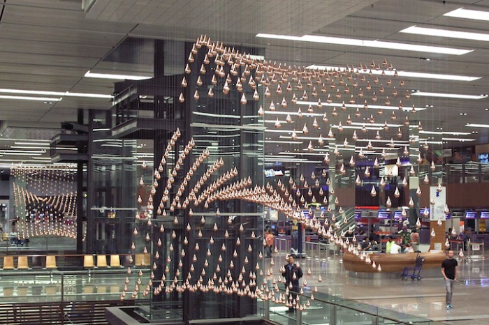 Волшебная кинетическая скульптура появилась в сингапурском аэропорту Чанги. 608 дождевых капель, сделанных из легкого алюминия, двигаются в медленном танце, зачаровывая зрителей. Изысканная хореография длится 15 минут - блестящие капельки скользят на тонких тросах, то двигаясь синхронно, то разбиваясь на две волны.