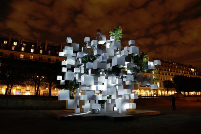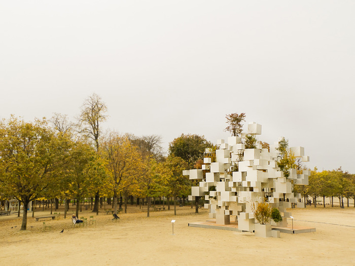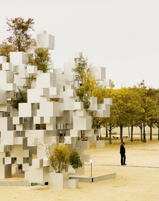 Оригинальная скульптура в виде хаотично взгроможденных друг на друга белых кубов различных размеров представляет собой впечатляющий арт-проект, автором которого стал известный японский дизайнер Со Фудзимото (Sou Fujimoto). Все элементы установки изготовлены из алюминия, а некоторые из них являются еще и горшками для растений, тем самым создавая иллюзию слияния скульптуры с окружающей природой. При взгляде на работу японского дизайнера, расположенную сегодня в парижском саду Тюильри, складывается впечатление, что инсталляция состоит из гигантских пикселей, каким-то невообразимым образом появившихся в реальном мире. Скульптура Фудзимото – интересный способ смешать цифровую концепцию с окружающим нас природой.