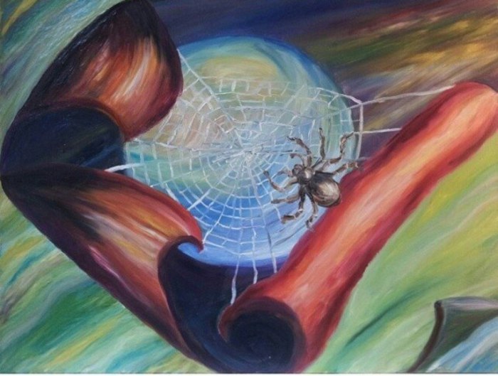 "Однажды мой друг попросил нарисовать картину, посвященную программистам. У меня родилась такая идея : паук о десяти ногах, как программист о десяти пальцах вьет паутину интернета и коммуникаций, плюс смена эпох как свернутые пергаменты наложены друг на друга..." - рассказывает Кирилл о картине "Программист".