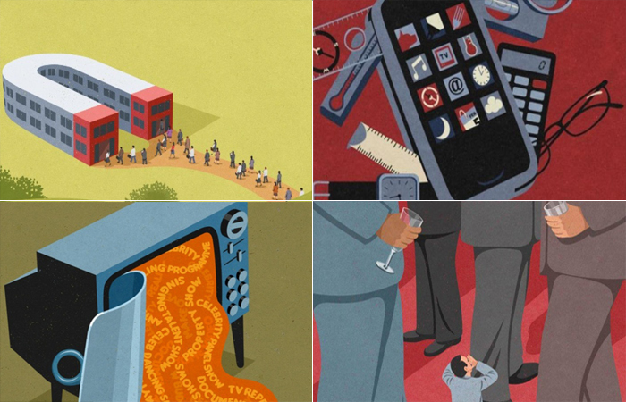 Серия иллюстраций о глобальных проблемах повседневности: сигареты, алкоголь, фаст-фуд, гаджеты, деньги, серые будни и прочих неотъемлемых составляющих нашей жизни. Живя в современном мире, мы перестаем замечать очевидное, становясь заложниками вредных привычек.