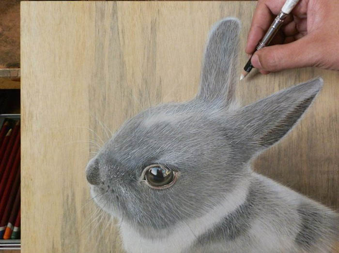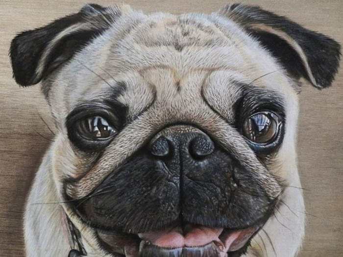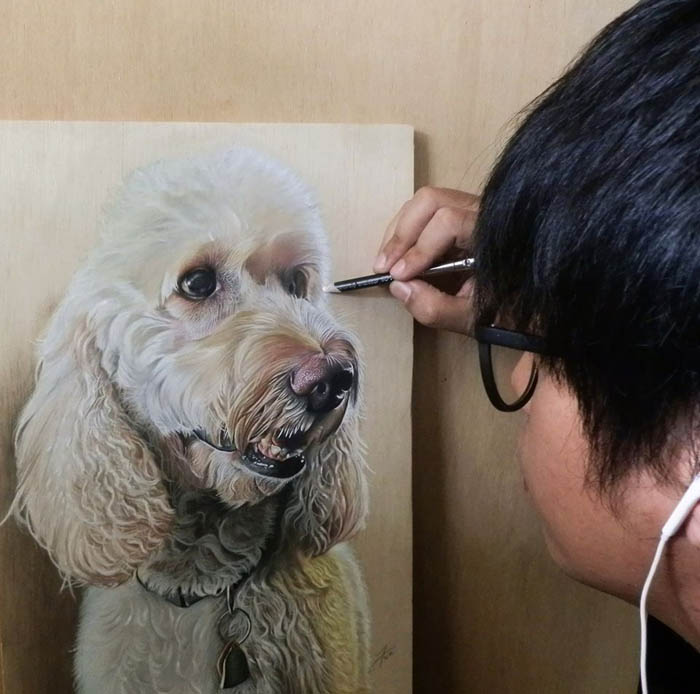 Ivan Hoo много лет специализируется на картинах, обманывающих зрение. Ранее он увлекался зарисовкой еды и обычных бытовых предметов – связок ключей, телефонов и других вещей, которые люди используют каждый день. Теперь в поле его зрения попали домашние любимцы. Удивительно, что все эти невероятно реалистичные рисунки автор делает при помощи пастельных карандашей. Он всегда использует один и тот же формат, выбирая доски из светлого гладкого дерева. На каждый рисунок у автора уходит примерно одна неделя – а очередь из клиентов, желающих получить портрет своего любимца, все растет.