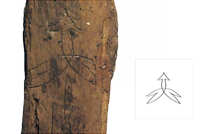 деревянное изделие из Старой Ладоги и прорись рисунка на изделии.