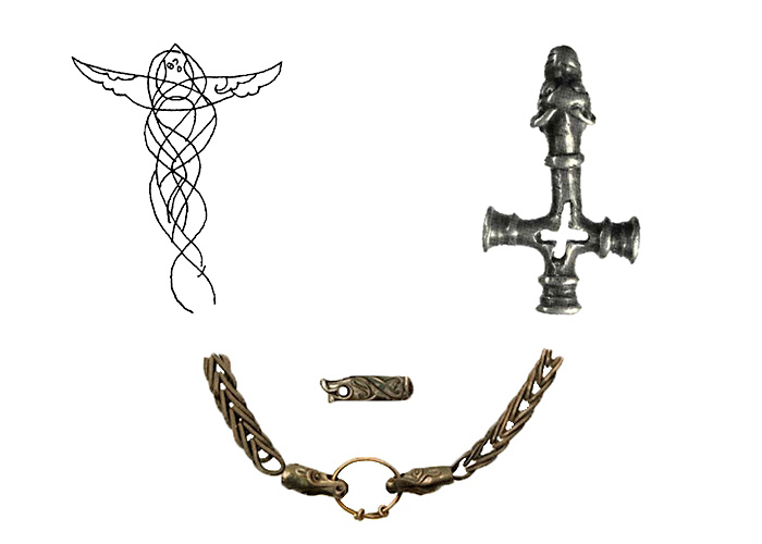 на серебряной чаше из Чернигова (птица?). / Серебряный крест из
