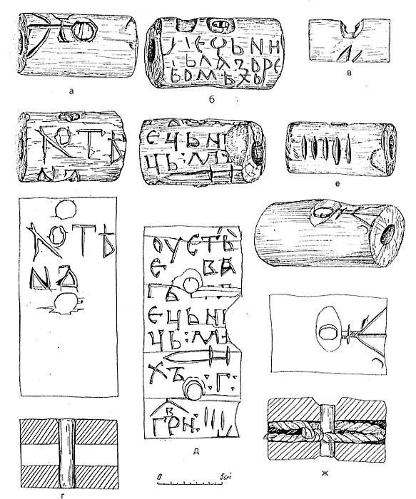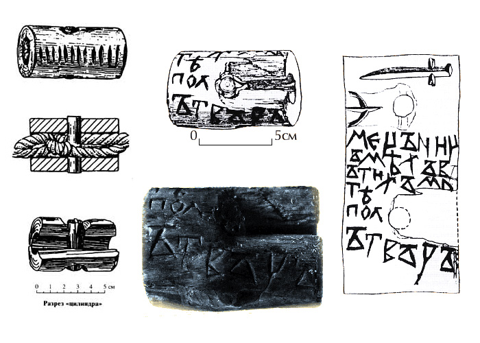 На некоторых вырезаны княжеские эмблемы, на цилиндре "мечника" - меч (от этого атрибута власти происходит и должностное обозначение чиновника). Цилиндр с упоминанием "мечника" в своей надписи сообщает о принадлежащем ему "мехе" (мешке). На трех найденных тогда предметах зафиксирована важная деталь: короткий (поперечный) канал в них плотно забит деревянной не извлекаемой пробкой, концы которой обрезаны вровень с поверхностью цилиндра.