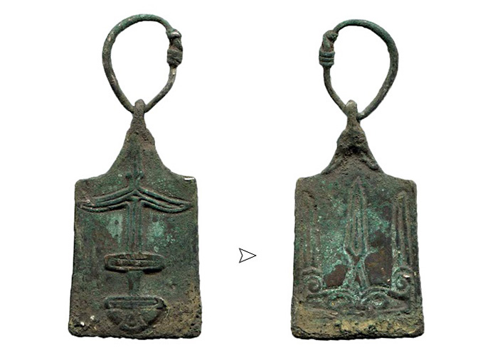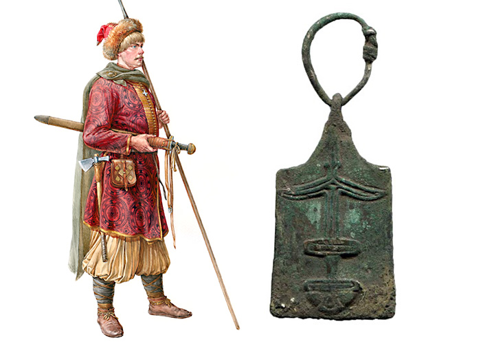 Серебряная древнерусская геральдическая подвеска: Трезубец Владимира Святославича (†1015) / Изображение меча типа V (Петерсон…)