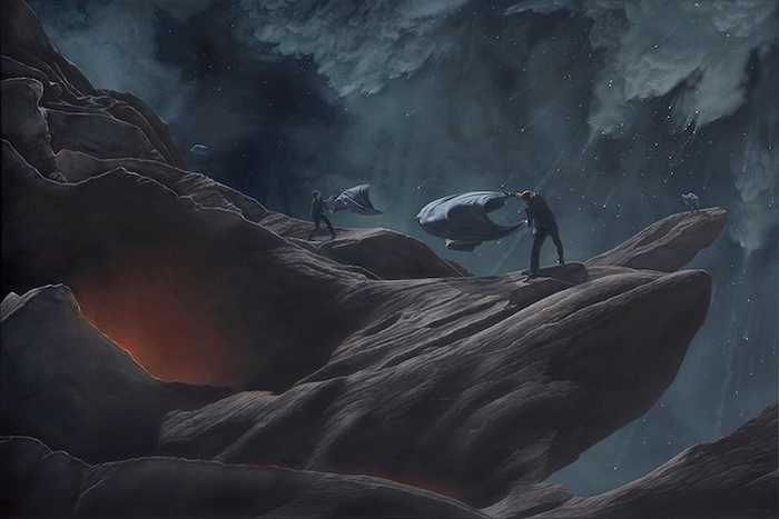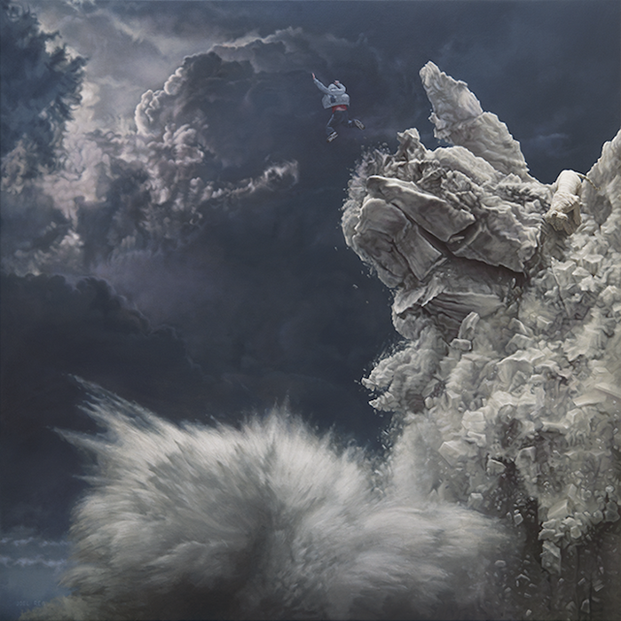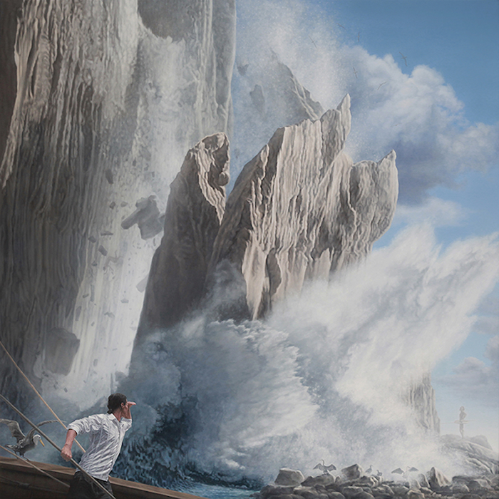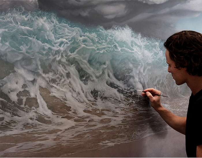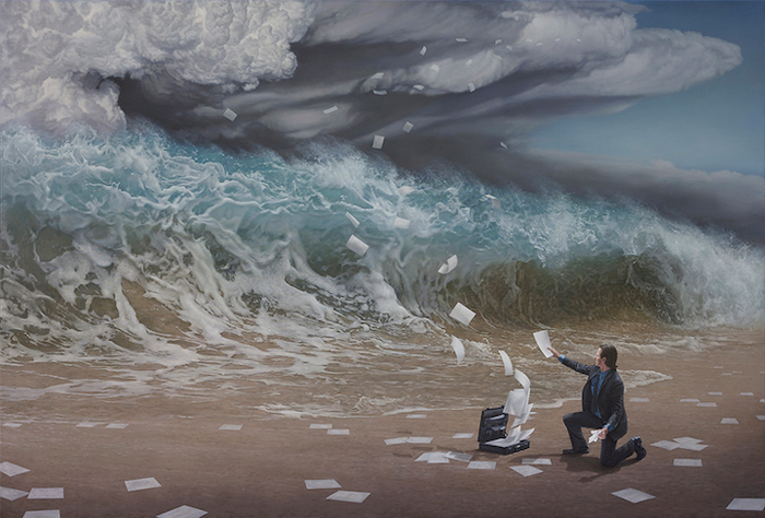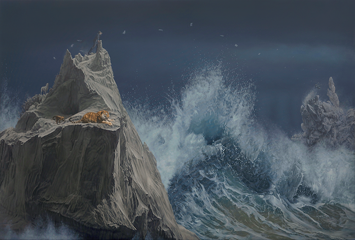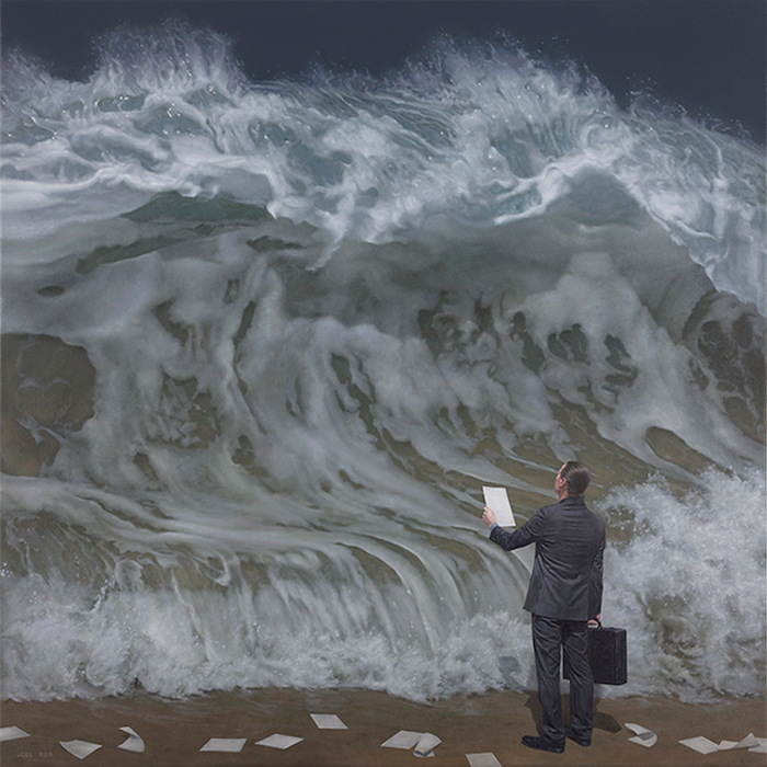 Шторм, беспощадно надвигающийся на человека или зверя, - вот мотив новых работ признанного австралийского художника Джоэля Ри. С помощью масляных красок Джоэль изображает на холсте удивительно реалистичные волны, ужасающие своим неотвратимым приближением, и противопоставляет им одетого в строгий костюм мужчину или загнанного в ловушку тигра. Возможно, это своеобразная аллегория одиночества, может быть - страха. Художник предоставляет решить это каждому зрителю для себя самостоятельно.