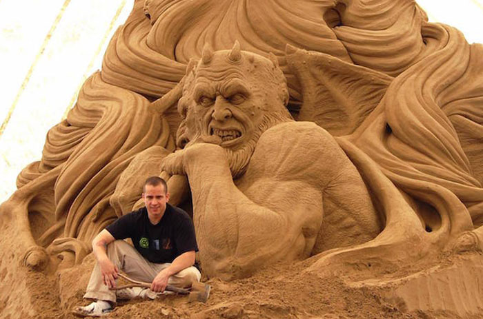 Для жителей Аризоны Рэй Виллафейн (Ray Villafane) известен прежде всего как карвинг-мастер: его потрясающие тыквы на Хеллоуин неизменно попадают в поле внимание общественности. Однако с 2008 он также начал работать с песком, попробовав буквально "с ноля" создать скульптур из капризного материала в Италии. К своему собственному удивлению, у него получилось не только создать достойную работу, но и захватить внимание зрителей и других художников. С тех пор Рэй стал получать приглашения со всего мира на фестивали скульптур из песка.