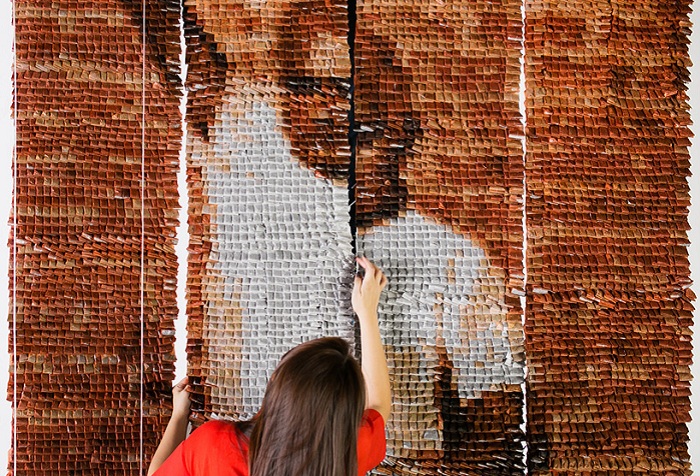Художница Хун И (Hong Yi, Малайзия), известная также под псевдонимом Red, не перестает удивлять своих поклонников оригинальностью используемых в ее творчестве материалов. На этот раз девушка выбрала пакетики чая. Хун И использовала их вместо красок для создания панно под названием «Teh tarik man».
