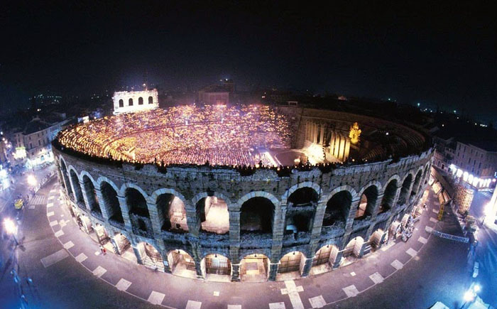 Арена Верона, расположенная на площади Бра в Вероне, Италия, была построена в 1 столетии н.э. Как в других амфитеатрах здесь проводили знаменитые гладиаторские бои с участием диких животных и людей. Сегодня это замечательное сооружение характеризуется прекрасной акустикой и уникальным расположением, что делает его идеальным местом театральных и оперных постановок для сотен тысяч зрителей, которые проходят в период сезона фестивалей. В длину амфитеатр имеет 140 м, а в ширину – 110 м. Внешние стены состоят из трех арочных этажей , которые были практически все разрушены землетрясением в 12 столетии, поэтому до сегодня осталось всего два этажа из белого и розового местного камня. Арена может разместить до 30 000 зрителей. Всего в амфитеатре 64 входа.
